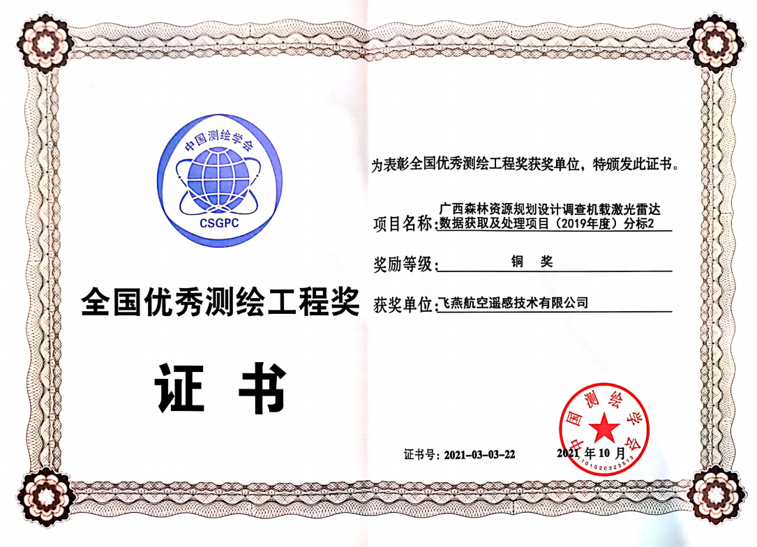 森林是人類的搖籃,發(fā)達(dá)的林業(yè)是國(guó)家富裕、社會(huì)文明的重要標(biāo)志。飛燕遙感承接的“廣西森林資源規(guī)劃設(shè)計(jì)調(diào)查機(jī)載激光雷達(dá)數(shù)據(jù)獲取及處理項(xiàng)目(2019年度)分標(biāo)2”助力廣西林業(yè)分析,摸清“家底”,榮獲2021年度全國(guó)優(yōu)秀測(cè)繪工程獎(jiǎng)銅獎(jiǎng)。