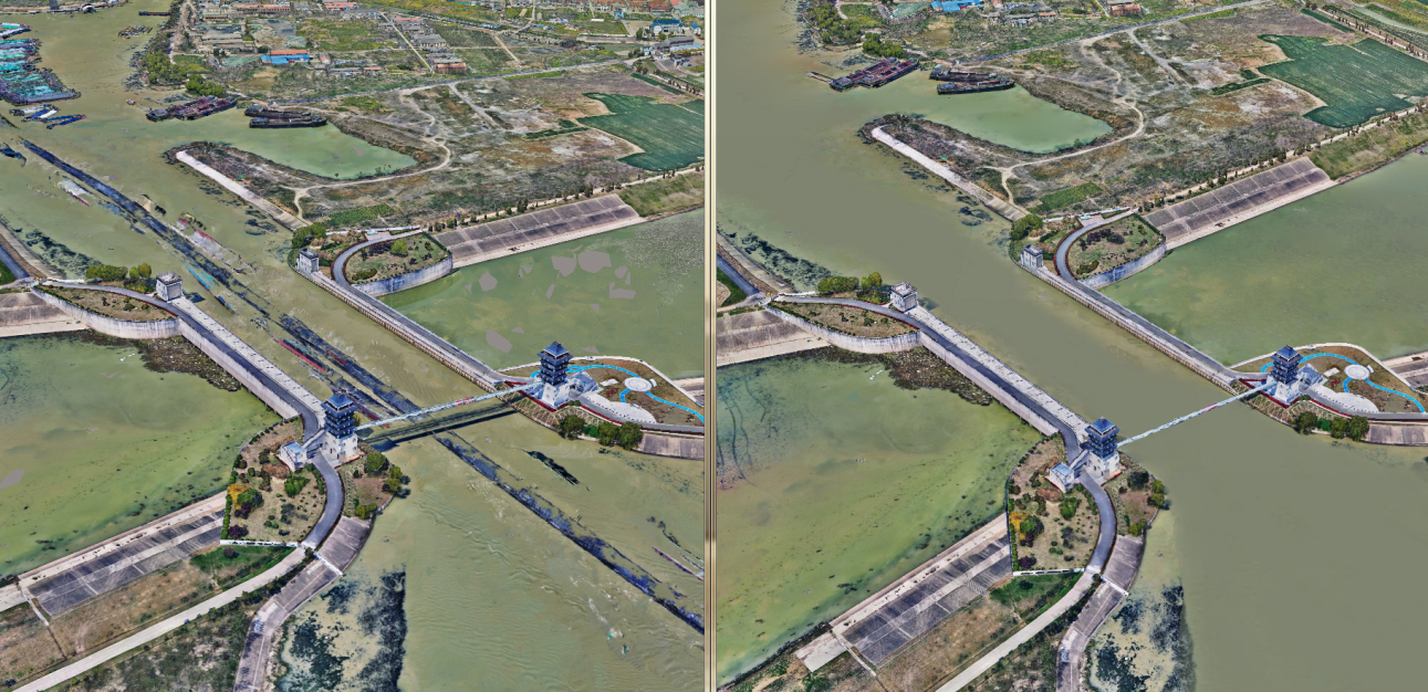 淮安地處江蘇省長江以北的核心地區,鄰江近海,為南下北上的交通要道,區位優勢獨特,涵蓋了京杭大運河、黃河故道等四條主要水系。通過軟件自動建模,不僅效果不佳,還需大量后期人工處理。在傳統的處理過程中,作業員分塊進行模型修改,不同作業員處理的水面會出現接邊問題,模型色彩過度不自然,影響最終效果。
