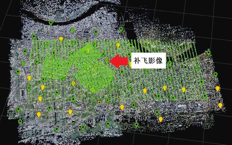 原數(shù)據(jù)空三與補(bǔ)飛數(shù)據(jù)空三可分別進(jìn)行,可加快項(xiàng)目進(jìn)程,提升效率。在實(shí)景三維重建環(huán)節(jié)將兩部分?jǐn)?shù)據(jù)進(jìn)行融合,通過生成的點(diǎn)云信息檢查數(shù)據(jù)融合效果。