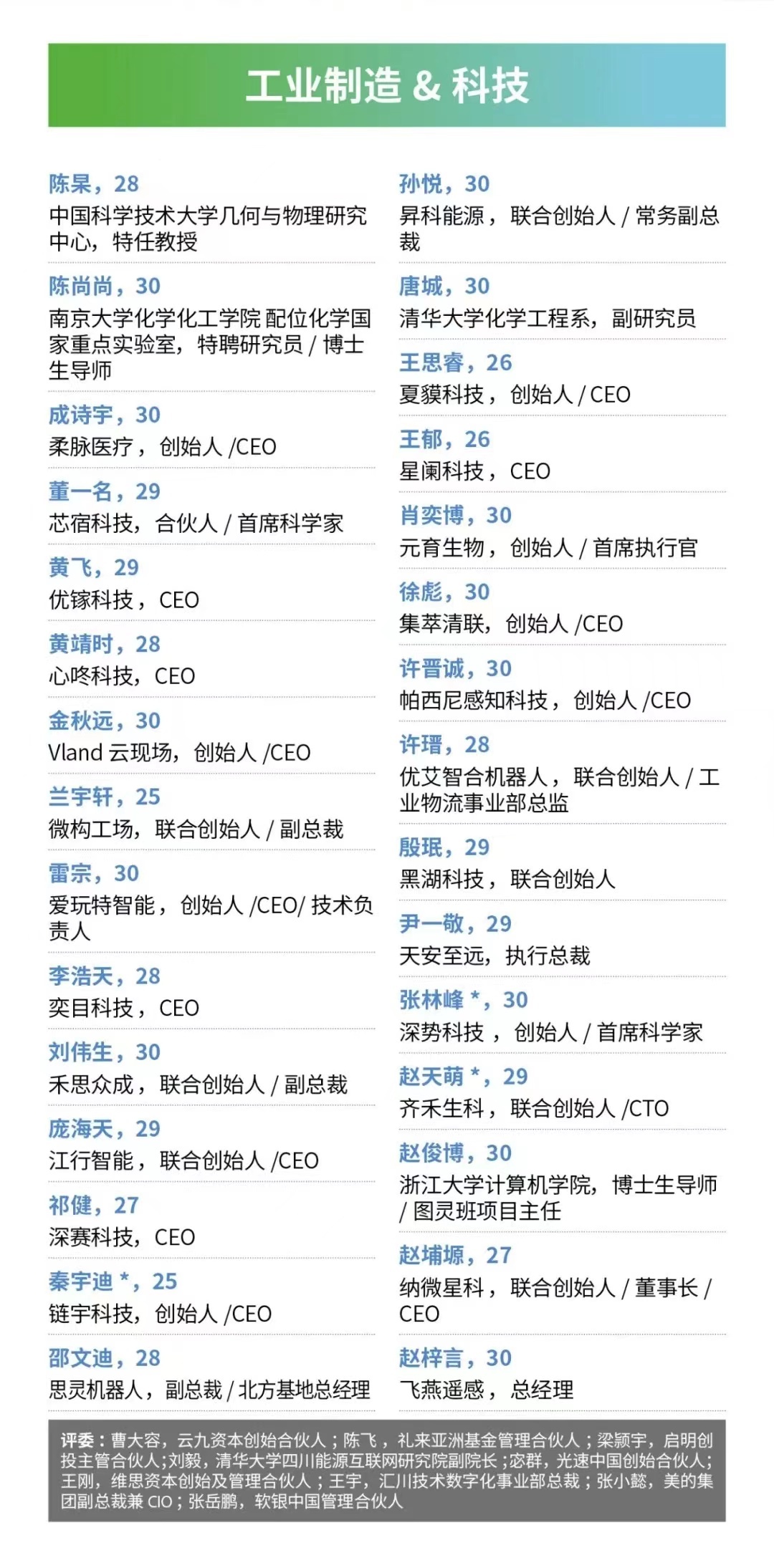 福布斯一貫以前瞻性的目光,尋找那些30歲以下,在業(yè)內(nèi)嶄露頭角,或者展現(xiàn)出成為未來(lái)行業(yè)及社會(huì)翹楚的潛在力量。