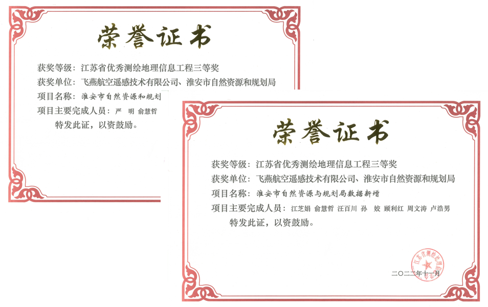 在智慧城市建設(shè)發(fā)展的進(jìn)程中,淮安市自然資源和規(guī)劃局為滿足淮安市1:1000正射影像圖數(shù)據(jù)更新、基礎(chǔ)地理信息數(shù)據(jù)更新,為智慧淮安時(shí)空大數(shù)據(jù)與云平臺(tái)建設(shè)奠定扎實(shí)的空間數(shù)據(jù)基礎(chǔ),在2021年組織了招標(biāo)。飛燕遙感有幸承接了該項(xiàng)目,并在2022年江蘇省優(yōu)秀測(cè)繪地理信息工程獎(jiǎng)中獲得三等獎(jiǎng)。