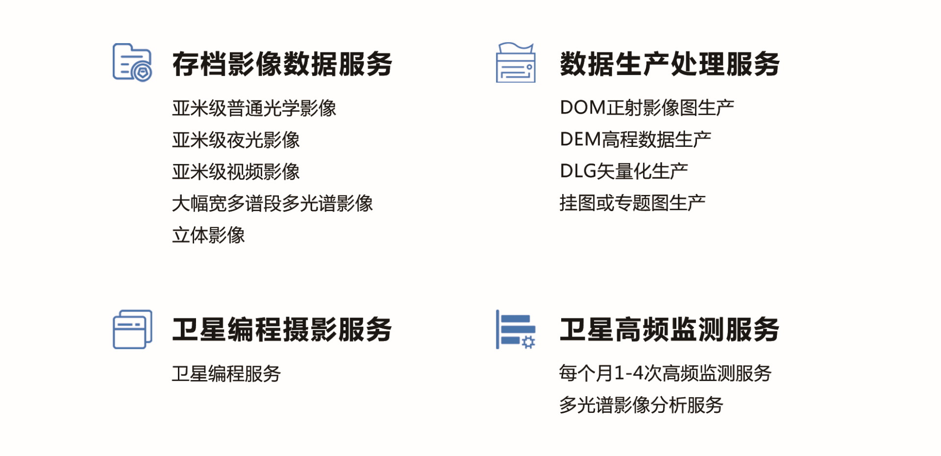數據處理服務多樣:提供存檔影像數據服務、衛星攝影編程服務、衛星影像數據標準產品及增值產品生產服務、衛星視頻數據標準產品及增值產品生產服務、衛星影像數據4D產品生產服務、面向行業用戶的遙感解譯分析服務。