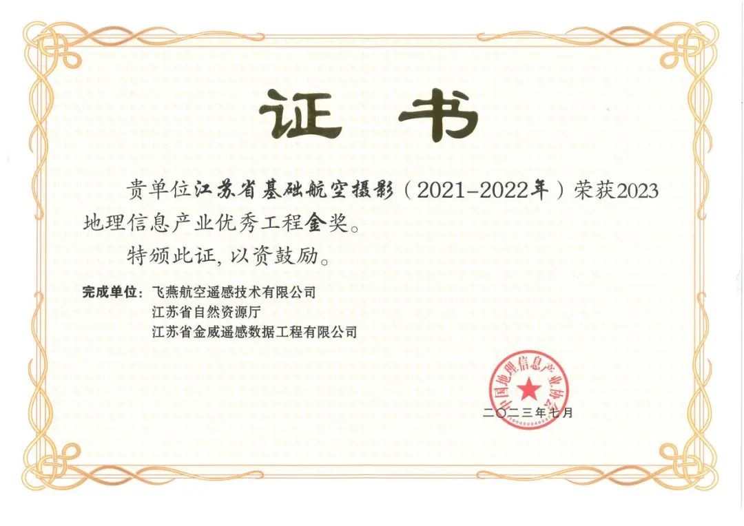 憑借《江蘇省基礎航空攝影》項目榮獲2023地理信息產業優秀工程金獎。