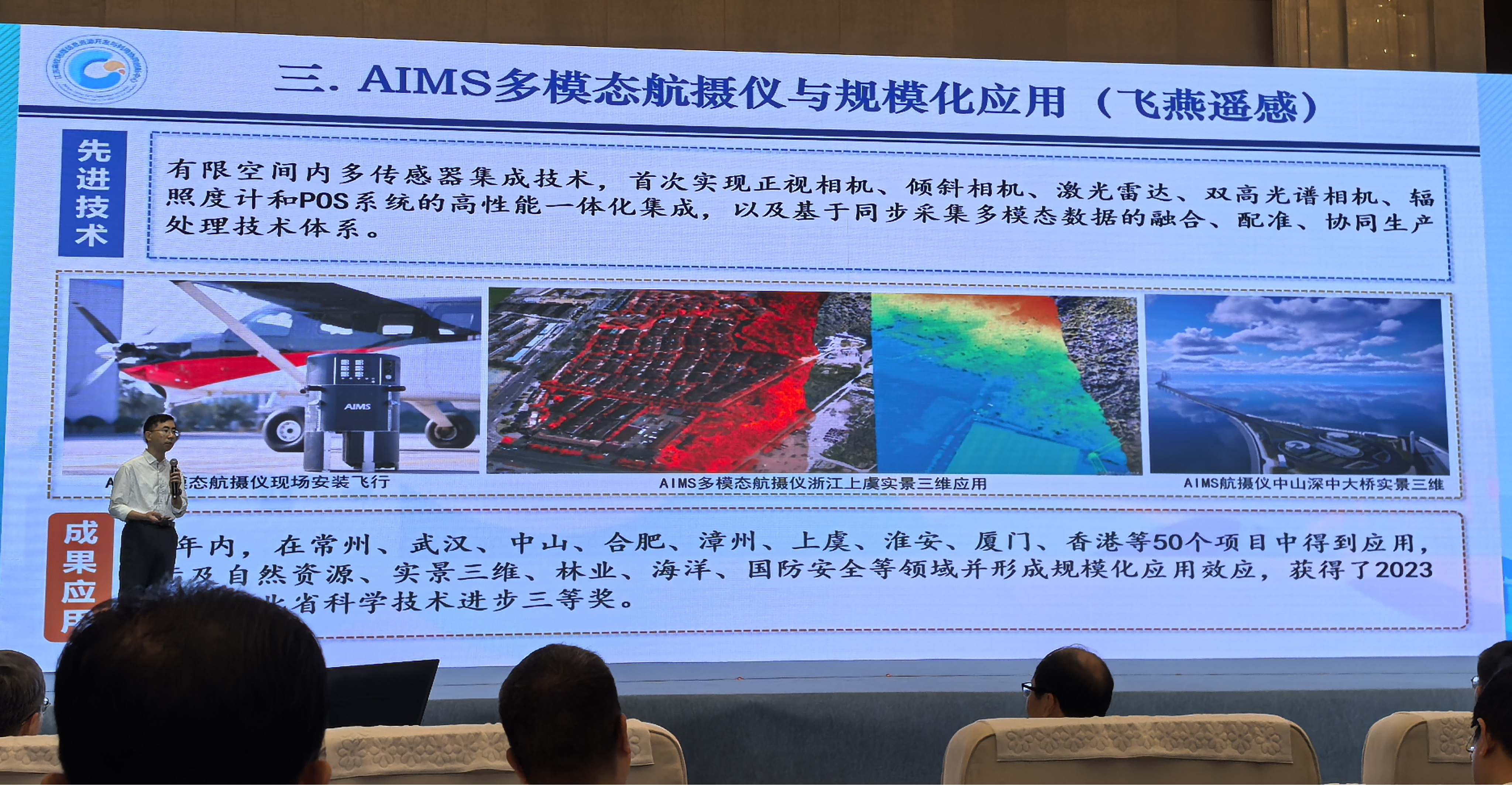 會上,多項地理信息協同創新代表性成果集中發布,省地理信息產業研究院副院長周良辰上臺發布最新成果。其中,飛燕遙感的AIMS多模態航攝儀的研制與規模化應用關鍵技術把數據要素作為贏在未來的革新力量。能夠一次性獲取多模異構、時相統一的航空遙感數據,實現地物全要素精細感知優勢。利用多模態數據協同提升處理、解譯和應用的自動化、智能化水平,形成特征豐富、關聯性強的系列數據產品,助力實景三維建設。