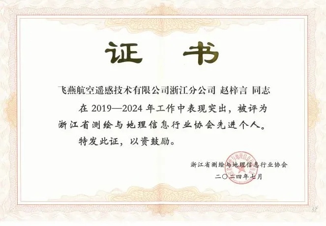 秉持“艱苦奮斗、開拓創新、守望相助、永攀高峰”企業核心價值,飛燕遙感總經理趙梓言榮獲浙江省測繪與地理信息行業協會先進個人。
