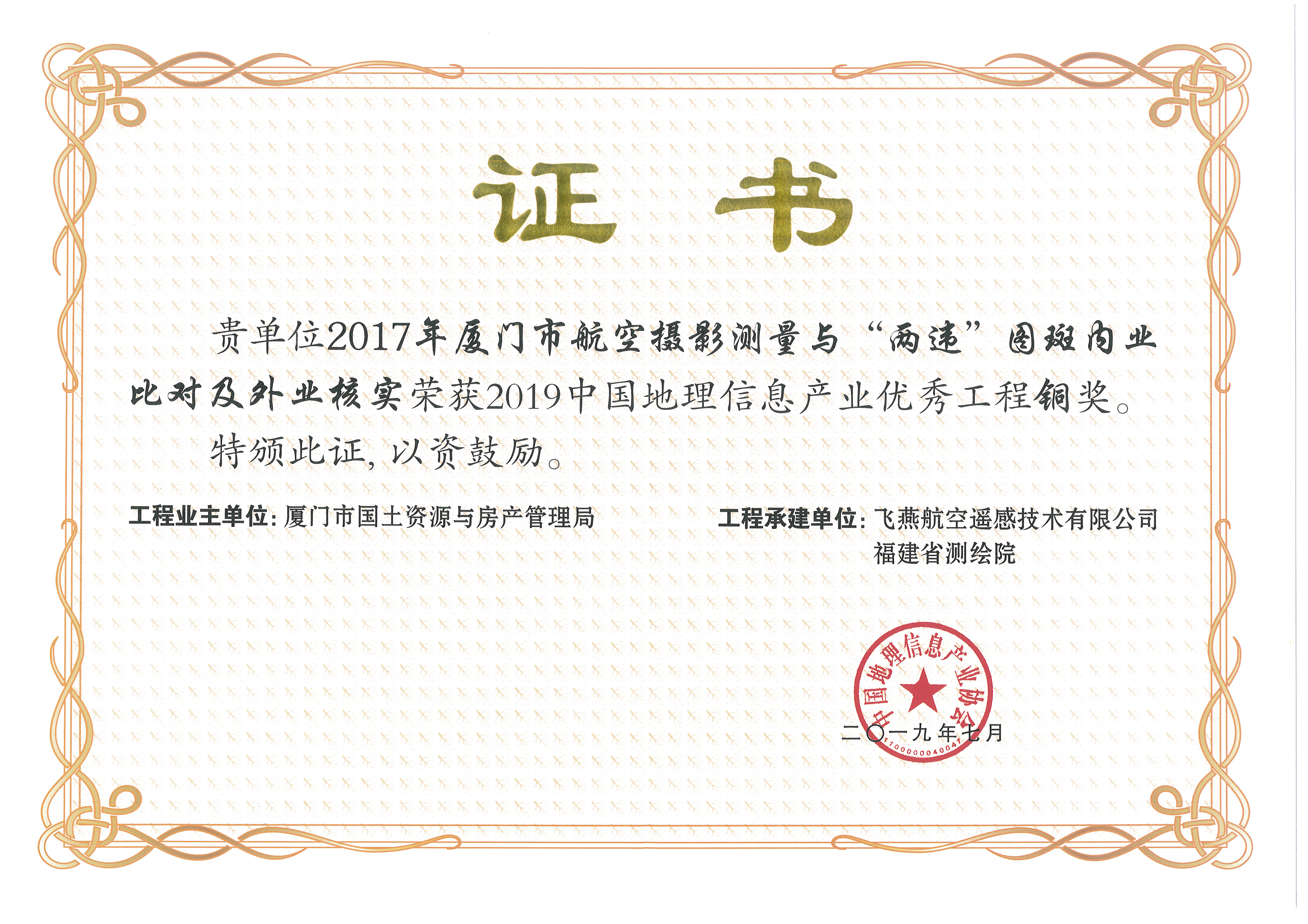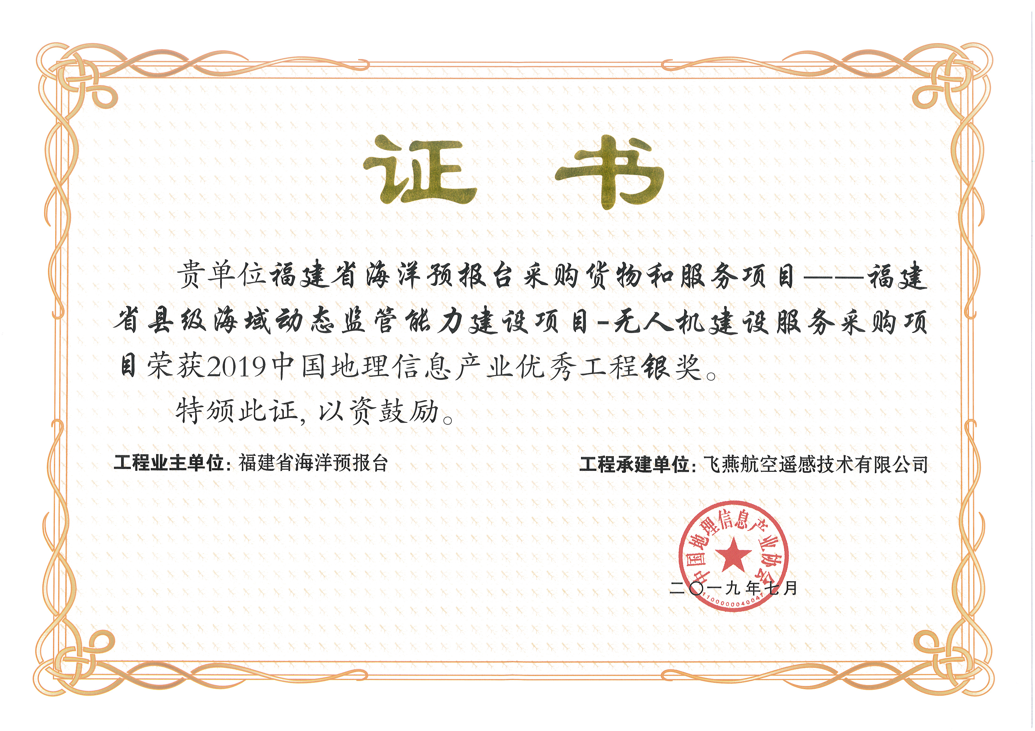 圖 飛燕遙感榮獲國家優秀工程獎證書